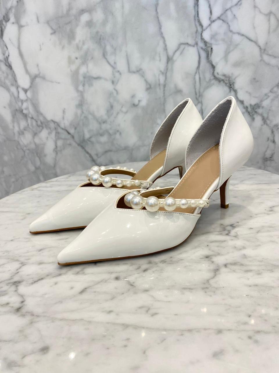 White Pearl Strap Pumps